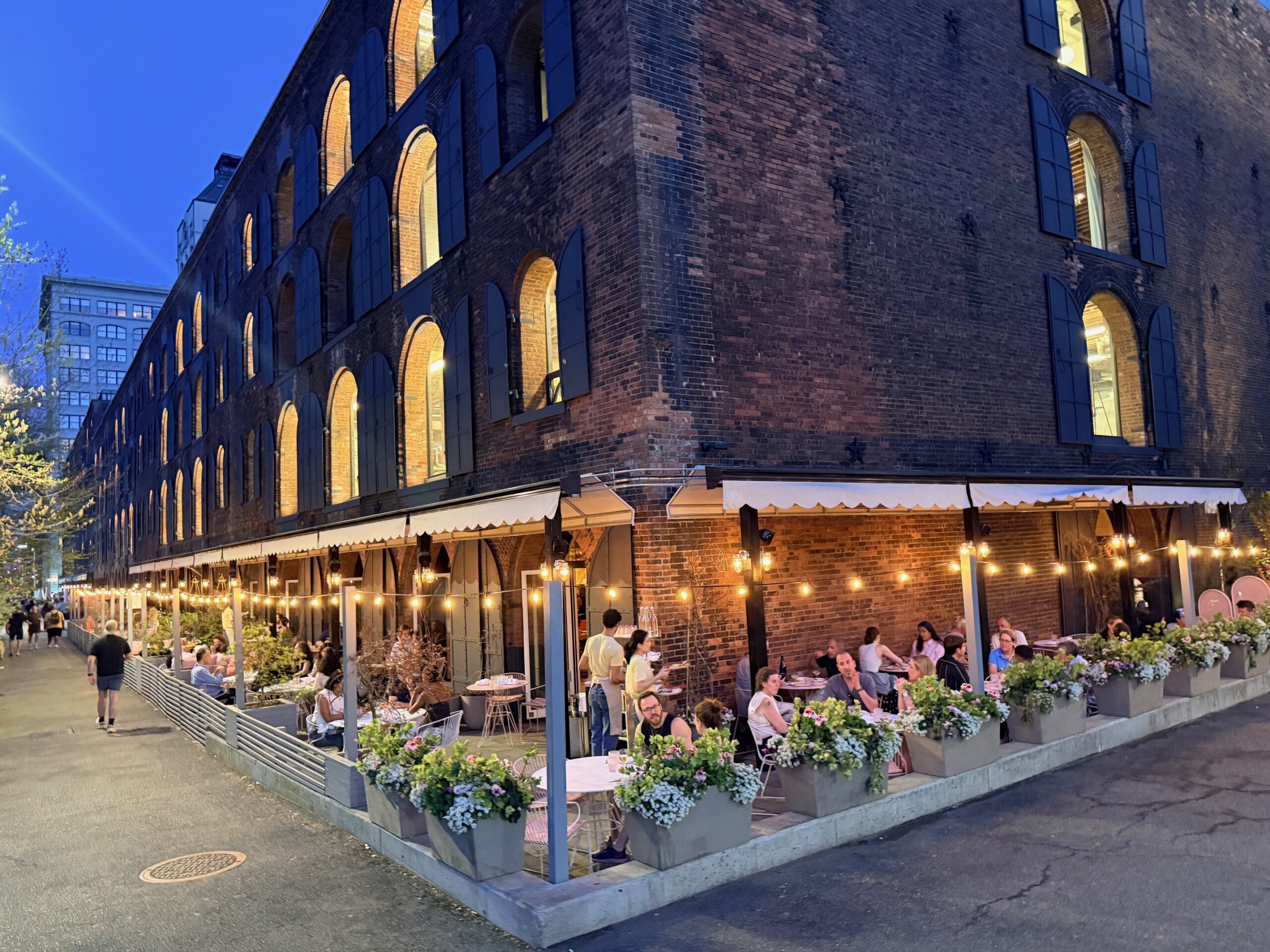 Threes Brewing | Threes Brewing in Gowanus offers a vibrant outdoor dining experience in its spacious, year-round patio known as The Yard. This 3,000-square-foot area is adorned with greenery, string lights, and a cozy atmosphere, featuring its own bar serving Threes Brewing’s signature beers, wines, and cocktails. The food has changed at Threes over time. Currently, the Boerum Hill oyster bar Grand Army has set up shop. They serving beer-battered cod, burgers, loaded crab fries, and event a Happy Meals for kids!