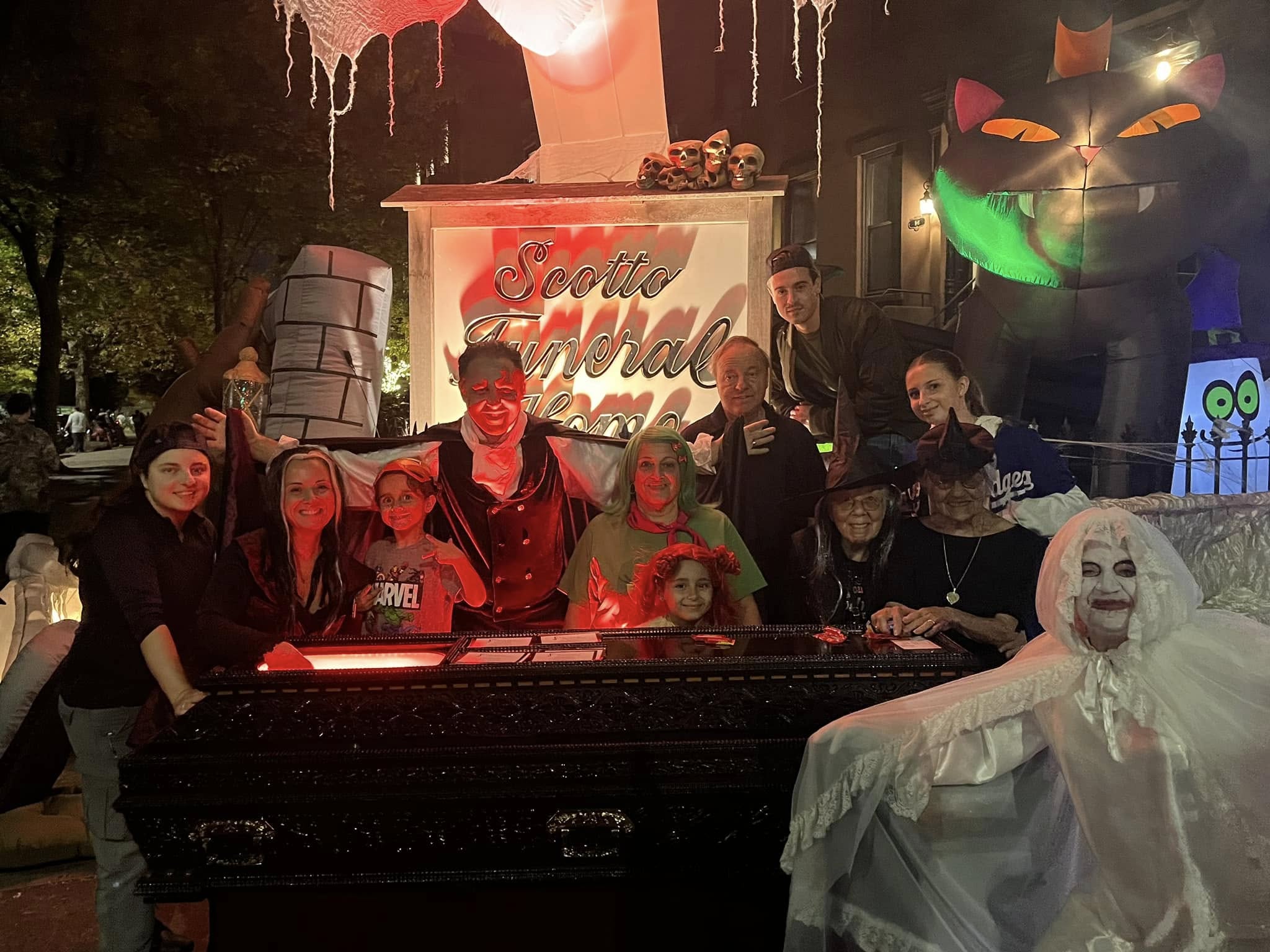 • Scotto Funeral Home | Court Street & First Place | Every Halloween, the staff Scotto Funeral Home (106 First Place) puts on an excellent Halloween display from 3:30 to 7pm and hands out candy.