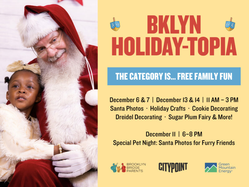 Join Brooklyn Bridge Parents and City Point for BKLYN HOLIDAY-Topia in December — a festive celebration featuring free Santa family photos, holiday crafts, dreidel decorating, and merry moments for everyone — including your furry friends. All activities will be free and best for all ages. Check out the great feature on News 12 Brooklyn from the first weekend here.