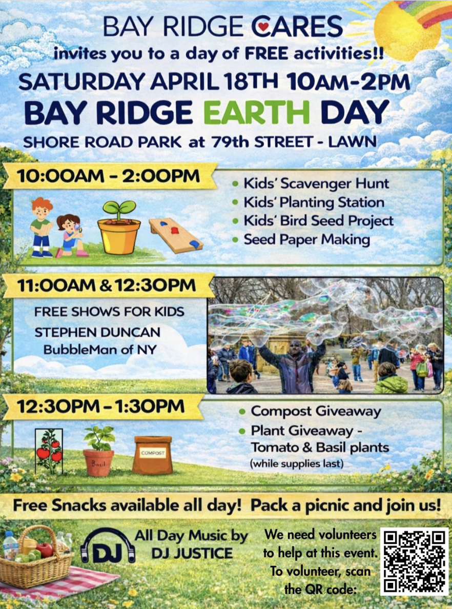 Come celebrate Earth Day in Bay Ridge. There will be children’s activities and shows, compost and plant giveaways, music, and snacks! Consider volunteering if you are able to.