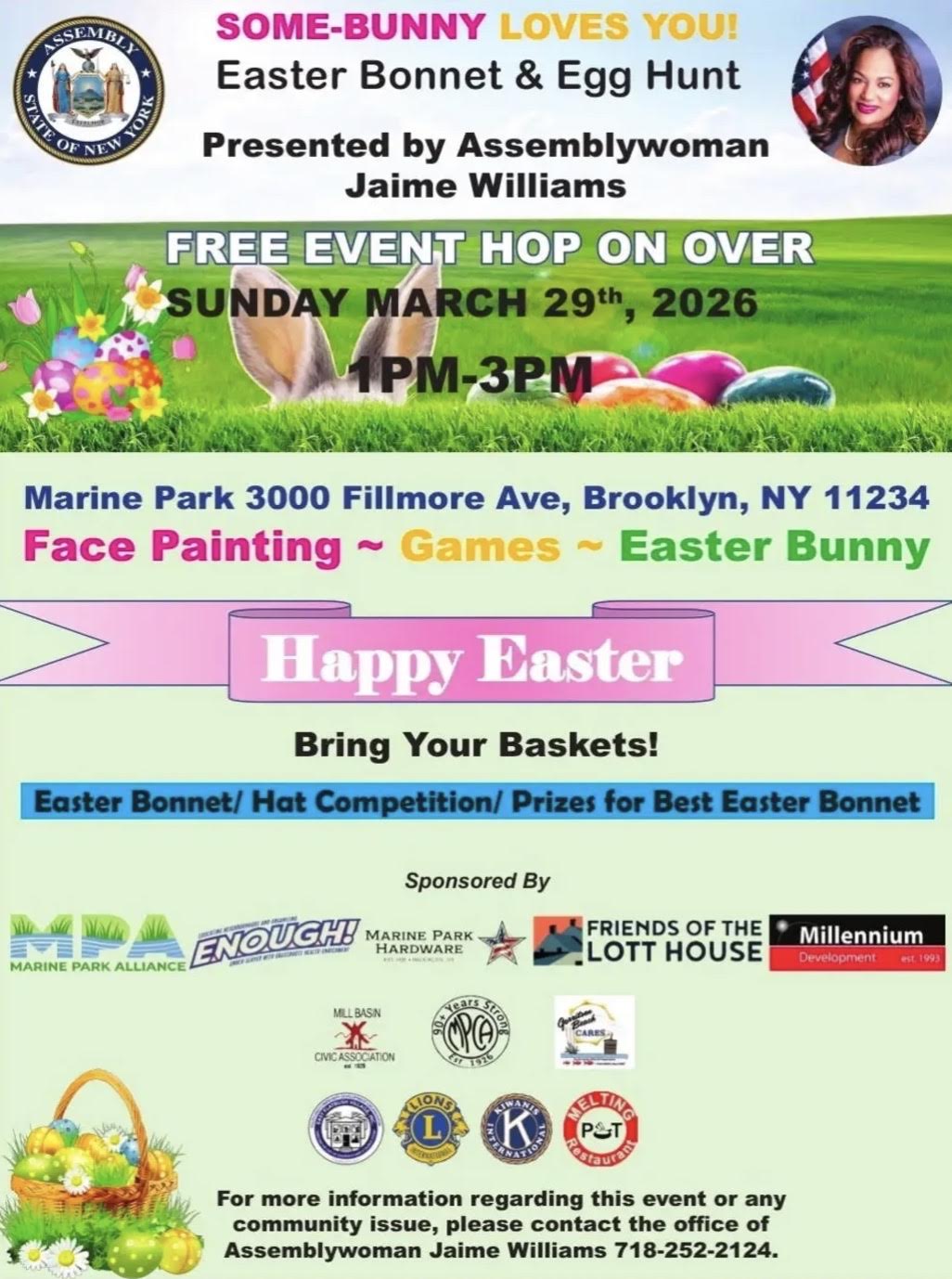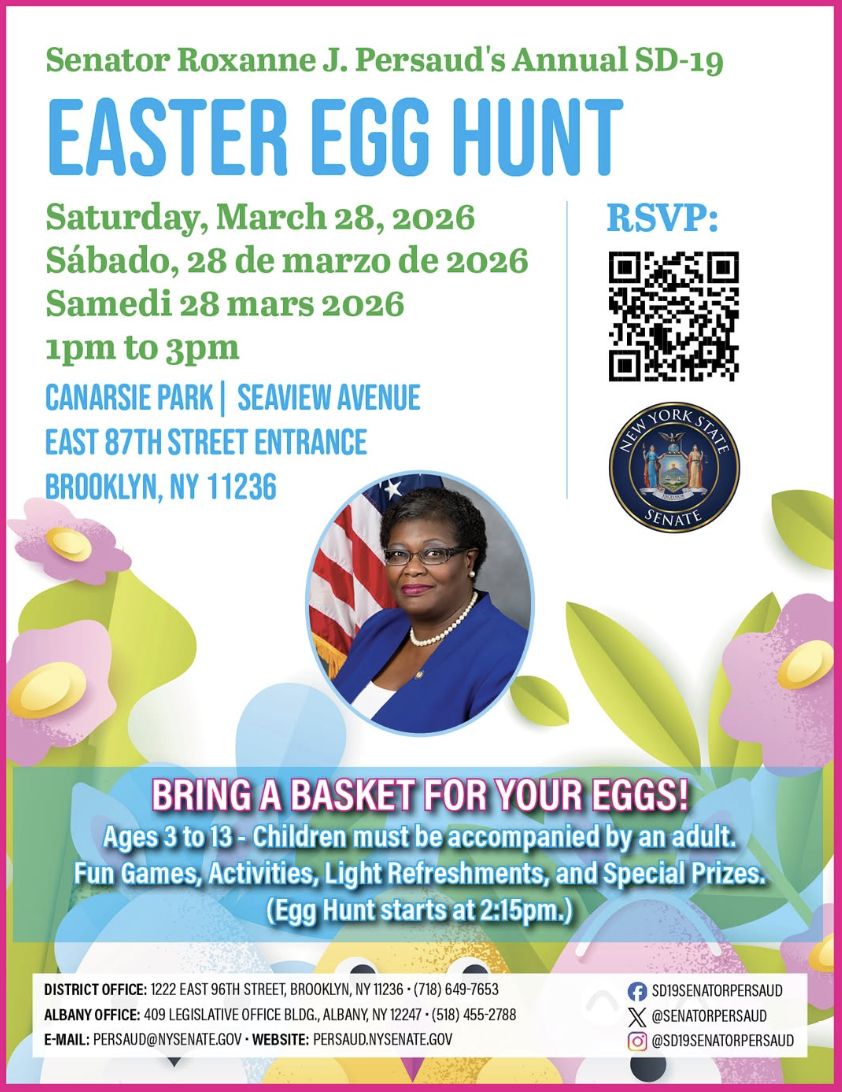 Senator Roxanne J. Persaud’s annual Easter egg hunt will include games, light refreshments, activities, and prizes. Be sure to bring a basket and all children must be accompanied by an adult.