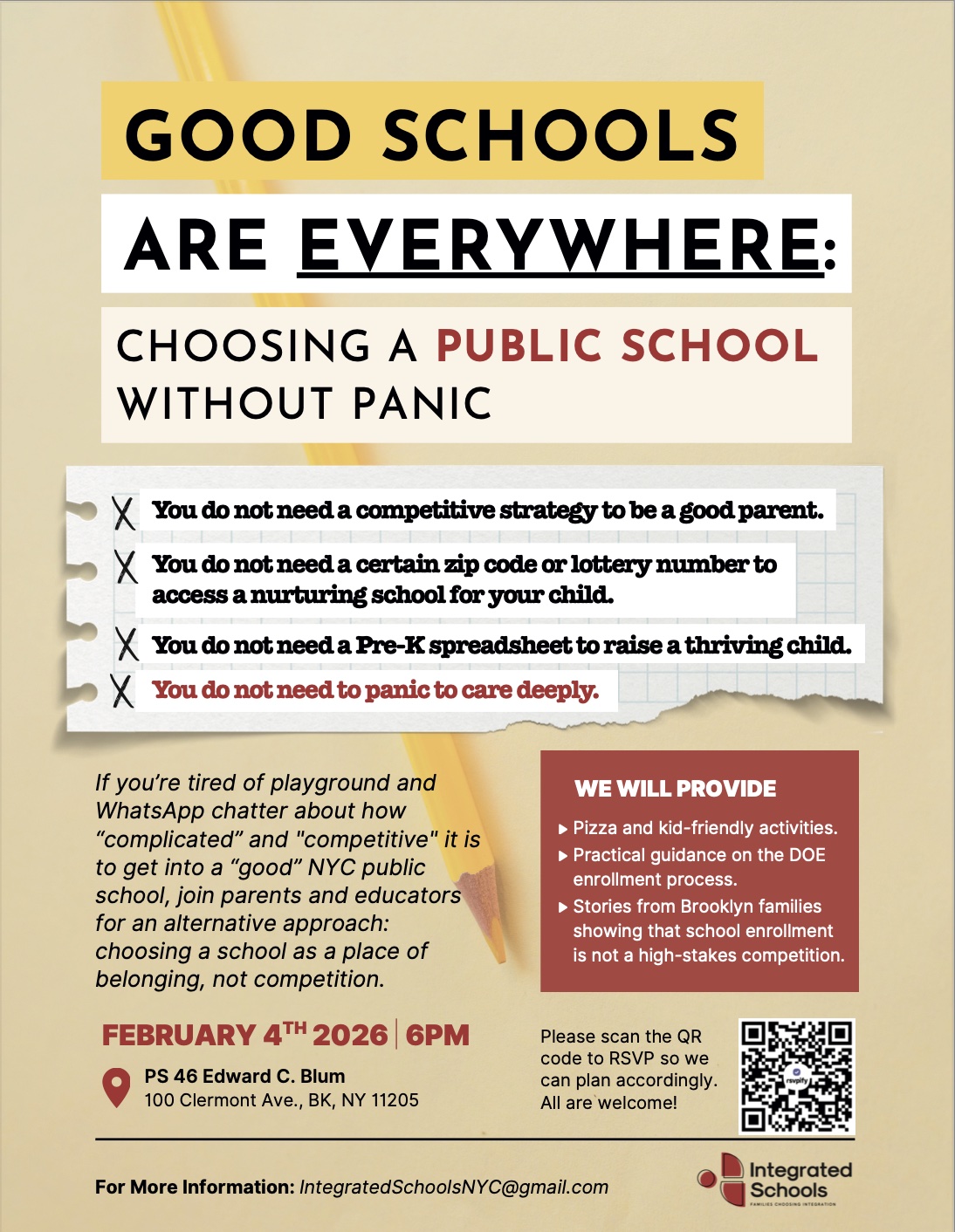 You do not need a competitive strategy to be a good parent. You do not need to panic to care deeply. If you’re tired of playground and WhatsApp chatter about how “complicated” and "competitive" it is to get into a “good” NYC public school, join parents and educators for an alternative approach: choosing a school as a place of belonging, not competition.