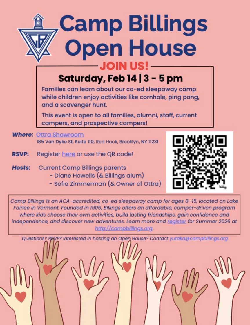 Join us for a family-friendly Camp Billings Open House hosted by Diane Howells, Camp Billings alum and current parent, and learn about our camp! Located at the Ottra Showroom (hosted by current Billings parent!), 185 Van Dyke Street.