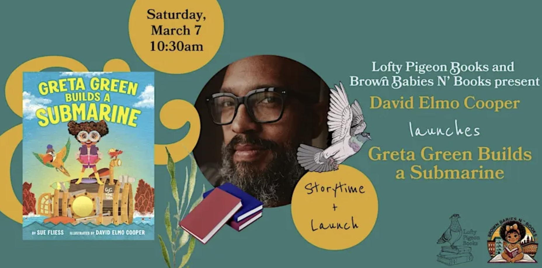 Join Lofty Pigeon Books, Brown Babies N’ Books, and David Elmo Cooper for a special Saturday storytime to celebrate the publication of Greta Green Builds A Submarine, a beautifully illustrated picture book about a pint-size pioneer of the sea dreaming as big as the ocean.