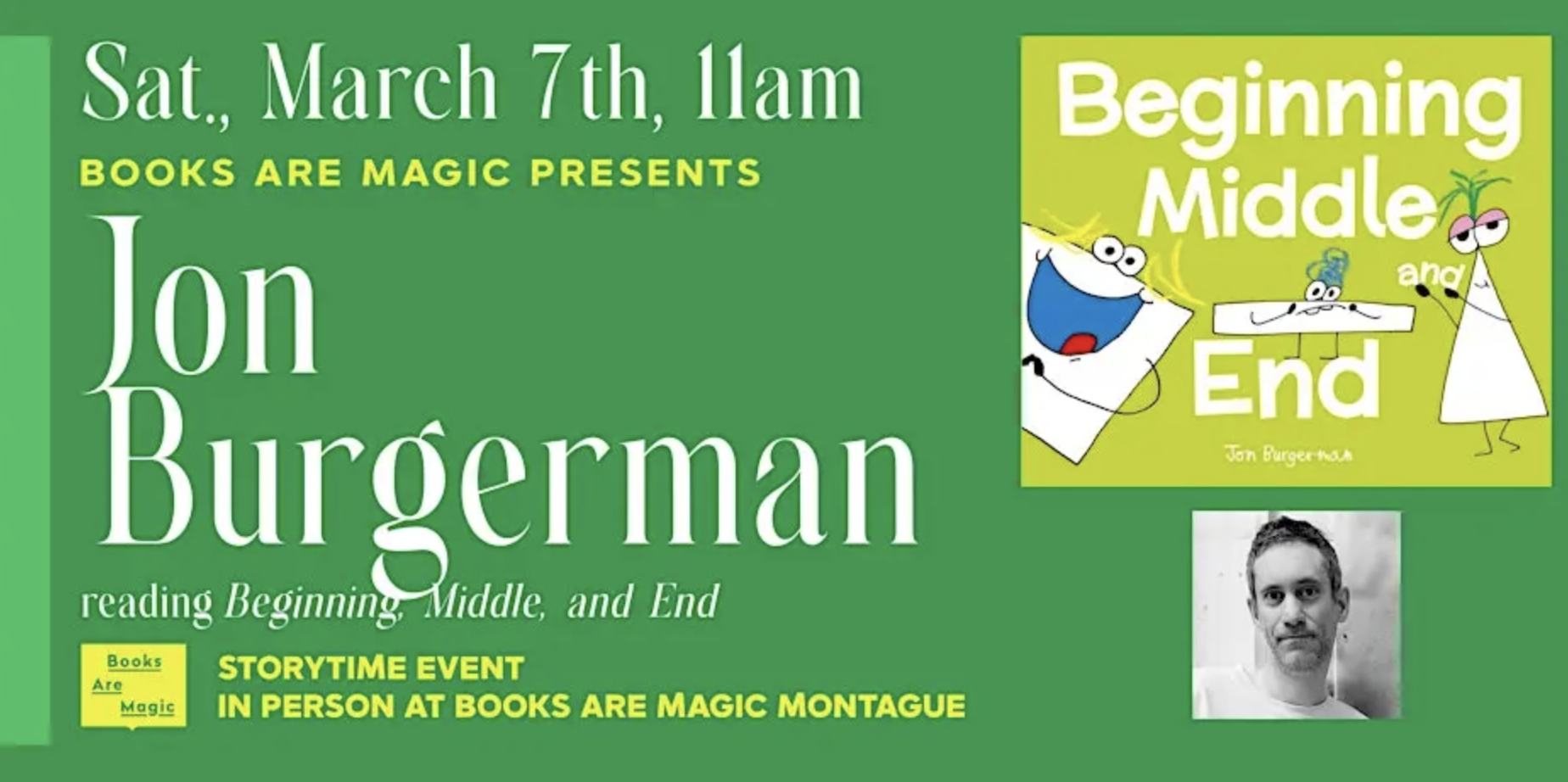 Head to Books Are Magic’s Montague Street location to hear a story about Beginning, Middle and End. They are trying to work out who is the most important! But a book can’t exist without the end, so Beginning and Middle set out to find End – and they come to realize how much they need each other – and how you can get the best out of everyone when you work together.