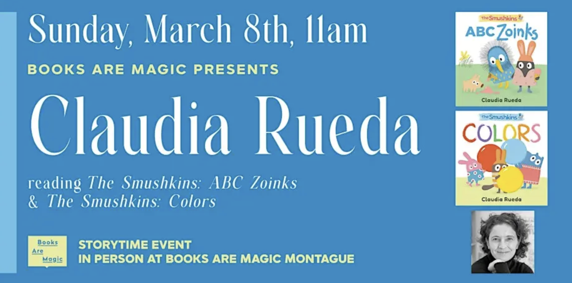 Stop by Books Are Magic’s Montague Street location to hear two Smushkins stories by author and illustrator Claudia Rueda.
