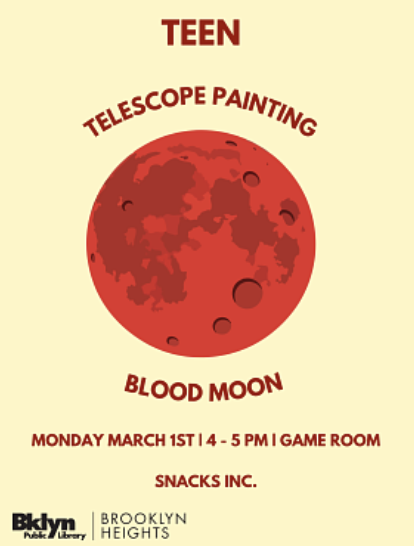 Come join the Brooklyn Heights Library in the Teen Gaming Room for a telescope painting session for the blood moon! The blood moon is expected to happened on March 2nd so come on the 1st to prepare! Snacks are included.