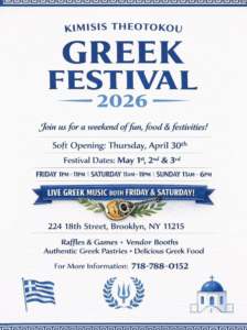 A weekend of authentic Greek food, live music, pastries, and family fun at the Kimisis Theotokou Greek Orthodox Church in Park Slope. Soft opening Thursday, April 30; full festival runs Friday, May 1 (1–11pm), Saturday, May 2 (11am–11pm), and Sunday, May 3 (11am–6pm). Live Greek music Friday and Saturday nights, plus raffles, games, vendor booths, and plenty of baklava.