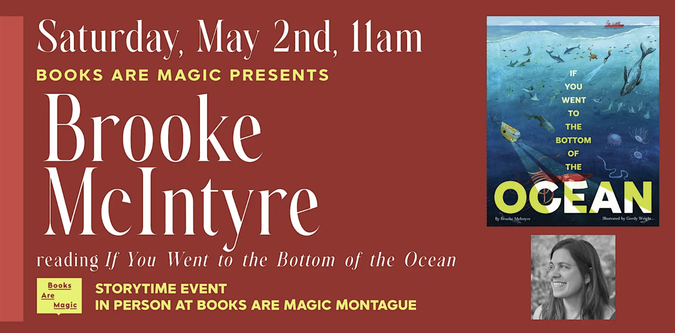 Come to Books are Magic’s Montague Street location for storytime with Brooke McIntyre, who writes nonfiction that puts kids in explorers’ shoes and takes them adventuring. Dive into this compelling, content‑rich nonfiction picture book and find yourself on an underwater adventure: a marine mission that takes you past reefs, beyond the near‑shore sea floor, down, down, down through the sunlight layer, the twilight layer, the midnight zone—all the way (as in seven miles!) down to the bottom of the ocean!