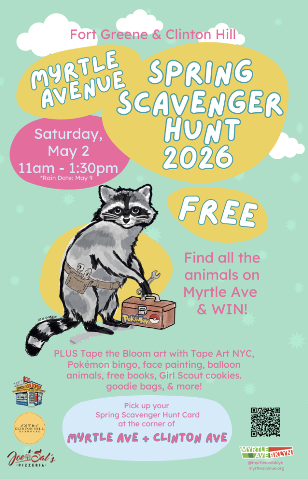 Spring is here and all kid sleuths, detectives, and curious explorers are invited to join in a free, family-friendly Spring Scavenger Hunt on Myrtle Avenue! Starting on April 24th, there will be 8 animals hidden in storefront windows along Myrtle (between Carlton Ave. & Hall St.). Find them all, collect your stamps, and redeem on May 2nd to receive a FREE goodie bag full of treats and prizes! On May 2nd, there will also be face painting, bingo, balloon animals, free books, and more!