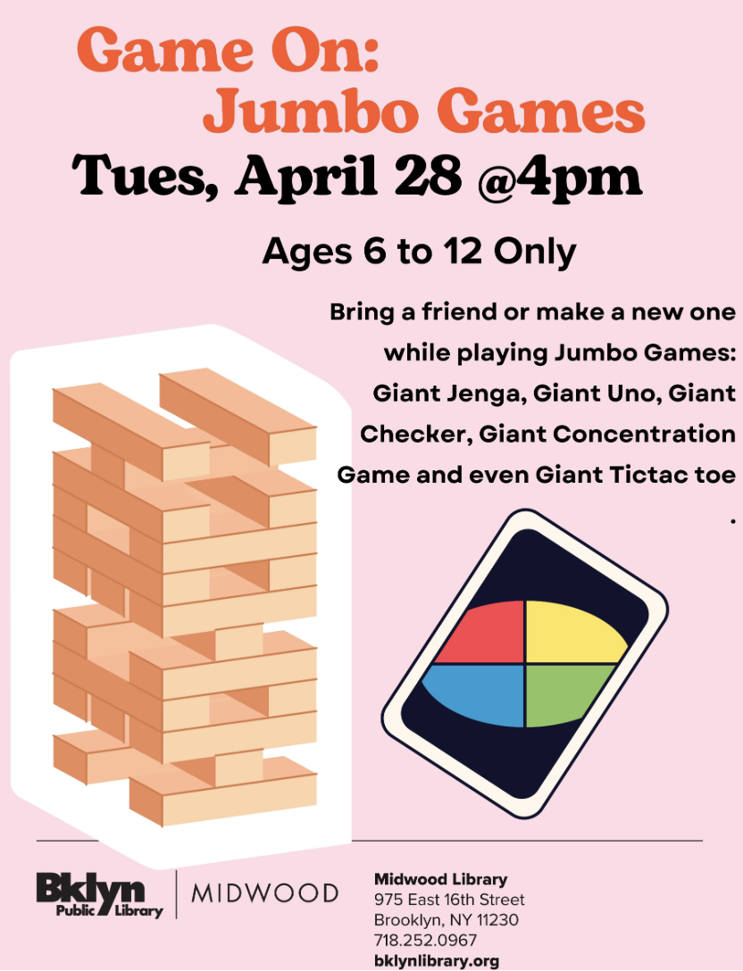 Bring a friend or make a new one while playing Jumbo Games: Giant Jenga, Giant Uno, Giant Checkers, Giant Concentration Game and Giant Tic Tack Toe. This event is at the Midwood Library.