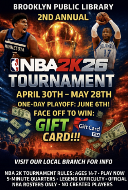 Join the Central Library for their 2nd annual NBA 2K26 Tournament for your chance to win fun prizes. The tournament is open to participants ages 14 to 17 and will run throughout the month of May, taking place once a week on Thursdays 4:30-6pm. The playoff and championship will be held at the Brooklyn Heights Branch on June 6th, 2026. The Saratoga Library will also have a tournament.