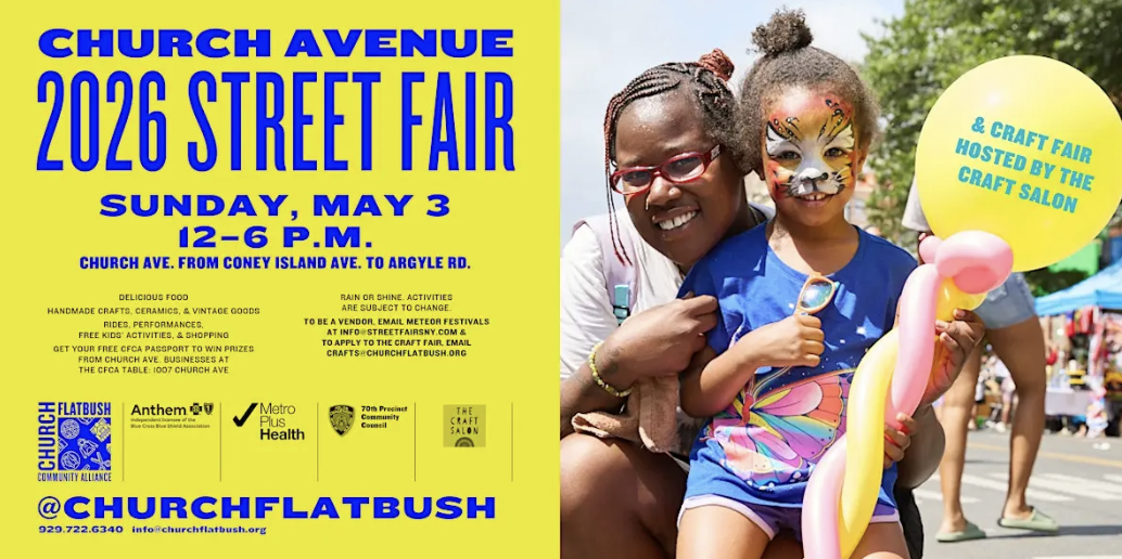 The Church Avenue 2026 Street Fair runs on Church Avenue from Argyle Road to Coney Island Avenue. Come by for rides, performances, free kids’ activities, and more!