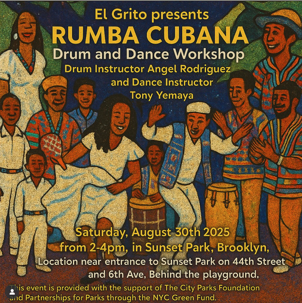 El Grito presents Rumba Cubana Drum and Dance Workshop with Drum Instructor Angel Rodriguez and Dance Instructor Tony Yemaya. Location near the entrance to Sunset Park on 44th Street and 6th Ave., behind the playground.
