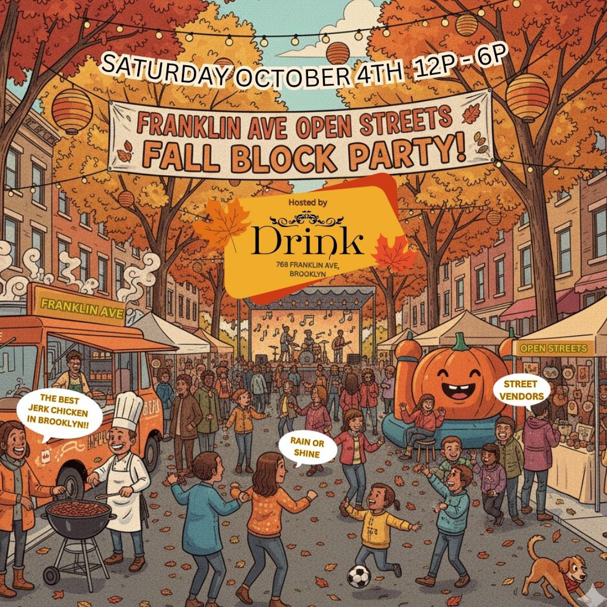Franklin Avenue Open Streets will come alive alive with jerk chicken, street vendors, DJs & more! Join for their Fall Festival Block Party!