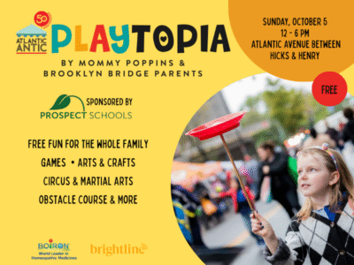 Join to celebrate the 50th annual Atlantic Antic™ with over one mile of food, crafts, and fun from Hicks Street to Fourth Avenue. This year, Playtopia with Mommy Poppins & Brooklyn Bridge Parents sponsored by Prospect Schools will be located between Hicks and Henry Streets in Cobble Hill near Brooklyn Bridge Park (Pier 6 entrance). Playtopia will be packed with FREE family-fun entertainment that includes MAJOR PLAY including a cardboard maze, obstacle course, balloon twisting, freebies, arts & crafts, interactive games, circus activities and much more for kids of all ages—all activities in our fun zone will be free! Learn more about this year’s Atlantic Antic™ here!
