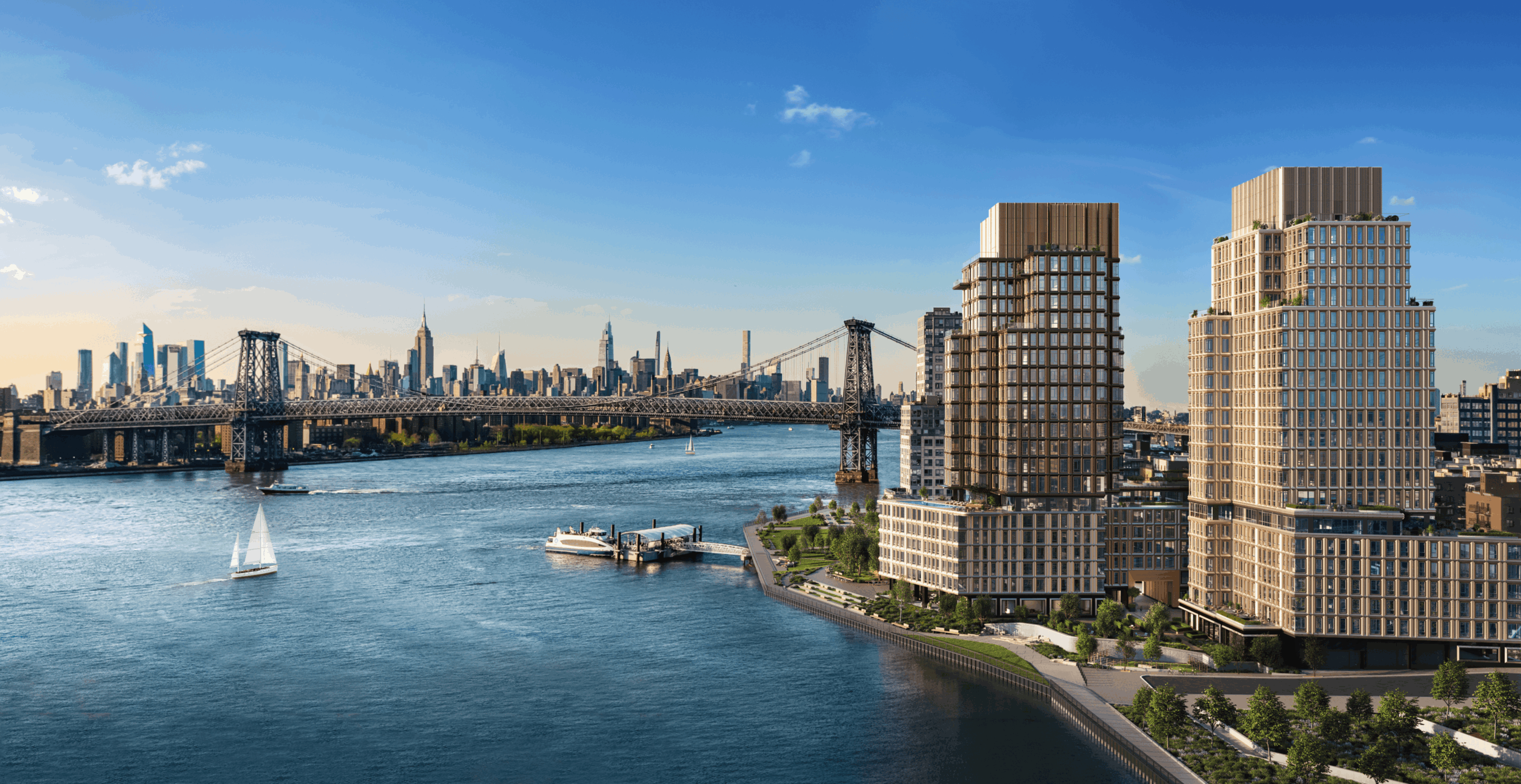 Construction is wrapping up on the first phase of Williamsburg Wharf, a 3.75-acre mixed-use development coming up on the South Williamsburg waterfront. The two-phase plan will bring five 22-story towers with nearly 1 million square feet of residential, commercial, and retail space, including 950 rental and condo units and an esplanade along the East River. Phase one spans three buildings—11 Wharf Way, One and Two Williamsburg Wharf, and Three Williamsburg Wharf—together housing more than 600 units and 17,500 square feet of commercial space, with Breads Bakery, The Goods Mart, and a new restaurant by chef Eyal Shani announced as retail tenants. Amenities range from fitness, co-working, and entertainment spaces to outdoor lawns, a waterfront promenade, and a pool that doubles as a skating rink in winter. The waterfront esplanade is already open to the public! Phase two, with two additional towers, remains in the planning phase.