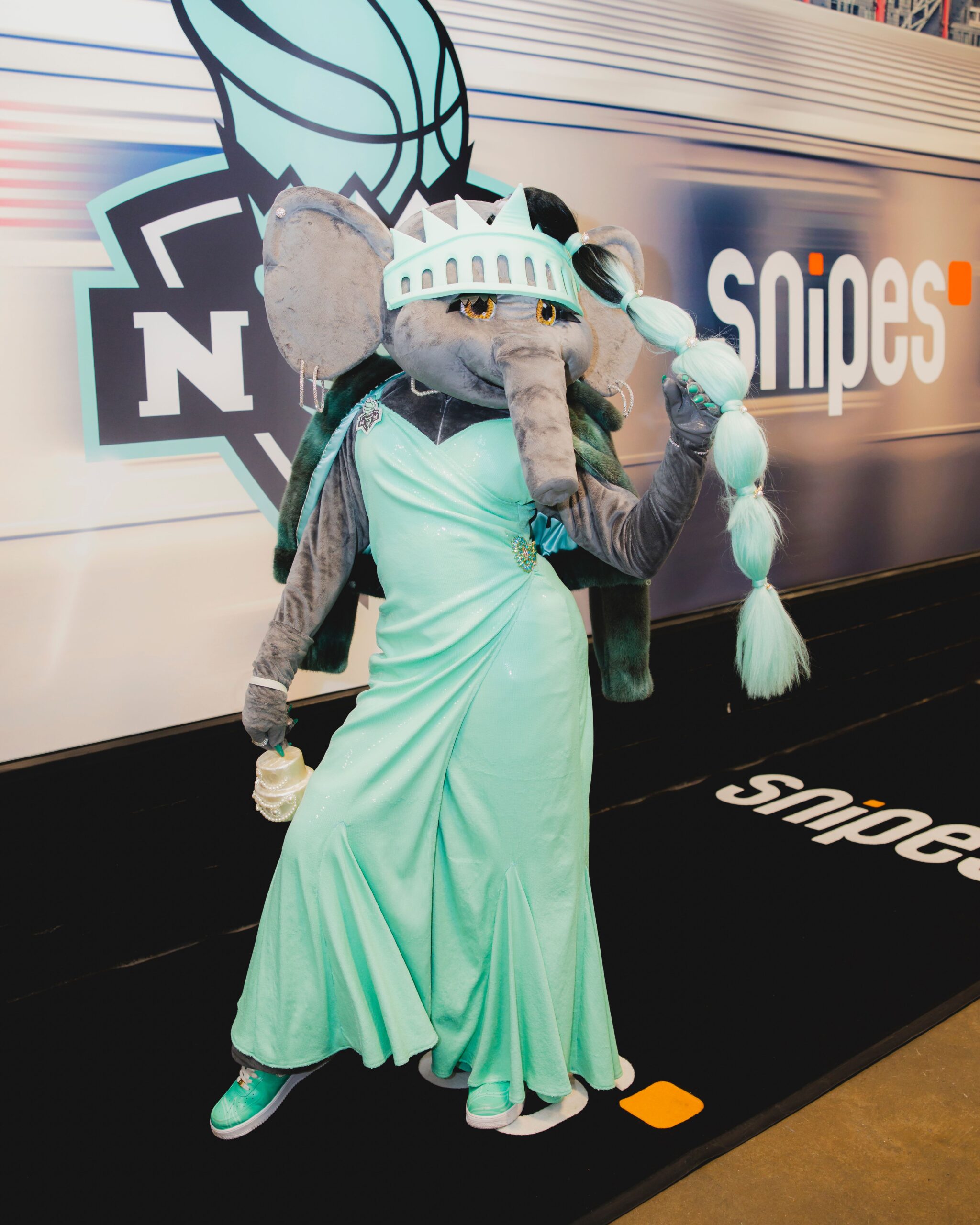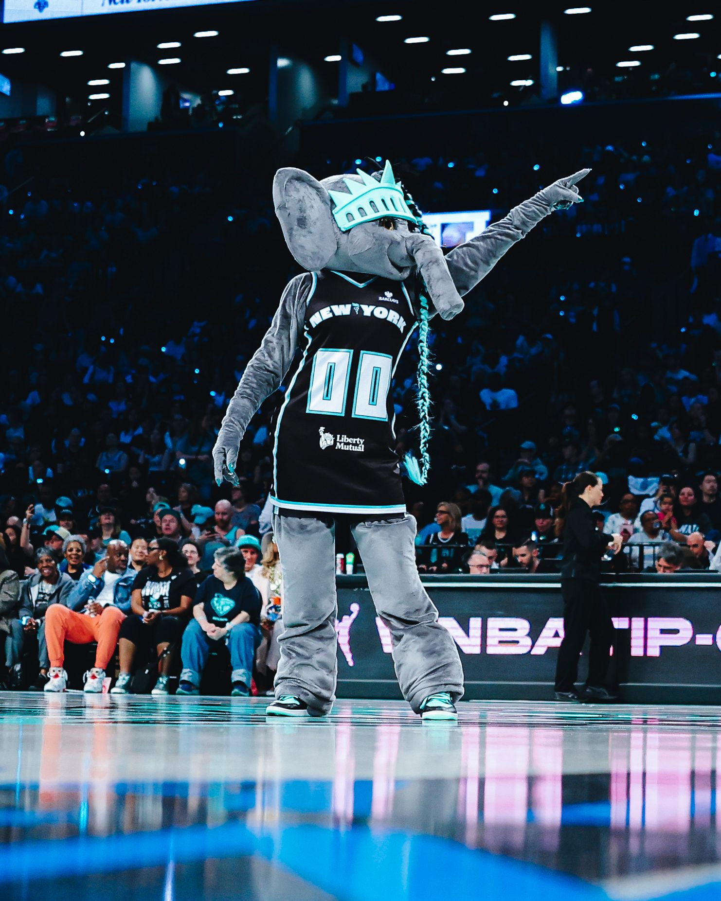 Ellie the Elephant is the Liberty’s fabulous mascot, who has become a viral sensation. The identity of the performer behind the Ellie costume is a mystery, but she is a real Brooklynite! Ellie, whose name pays homage to Ellis Island, is one of today’s hottest influencers and a fashion icon. She has nearly 200,000 TickTok followers, dances and twerks on the Barclays court during home games, and has even become a representative for brands like Rihanna’s Fenty Beauty. From halftime performances inspired by Beyoncé and Lil’ Kim to showing off various looks and designer handbags on the red carpet to gracing the cover of Time Out NY and the pages of Vogue, Ellie has become a celebrity in her own right. Follow her on Instagram or TikTok to stay up-to-date on all things Ellie—the dancing, the fashion, the fun!