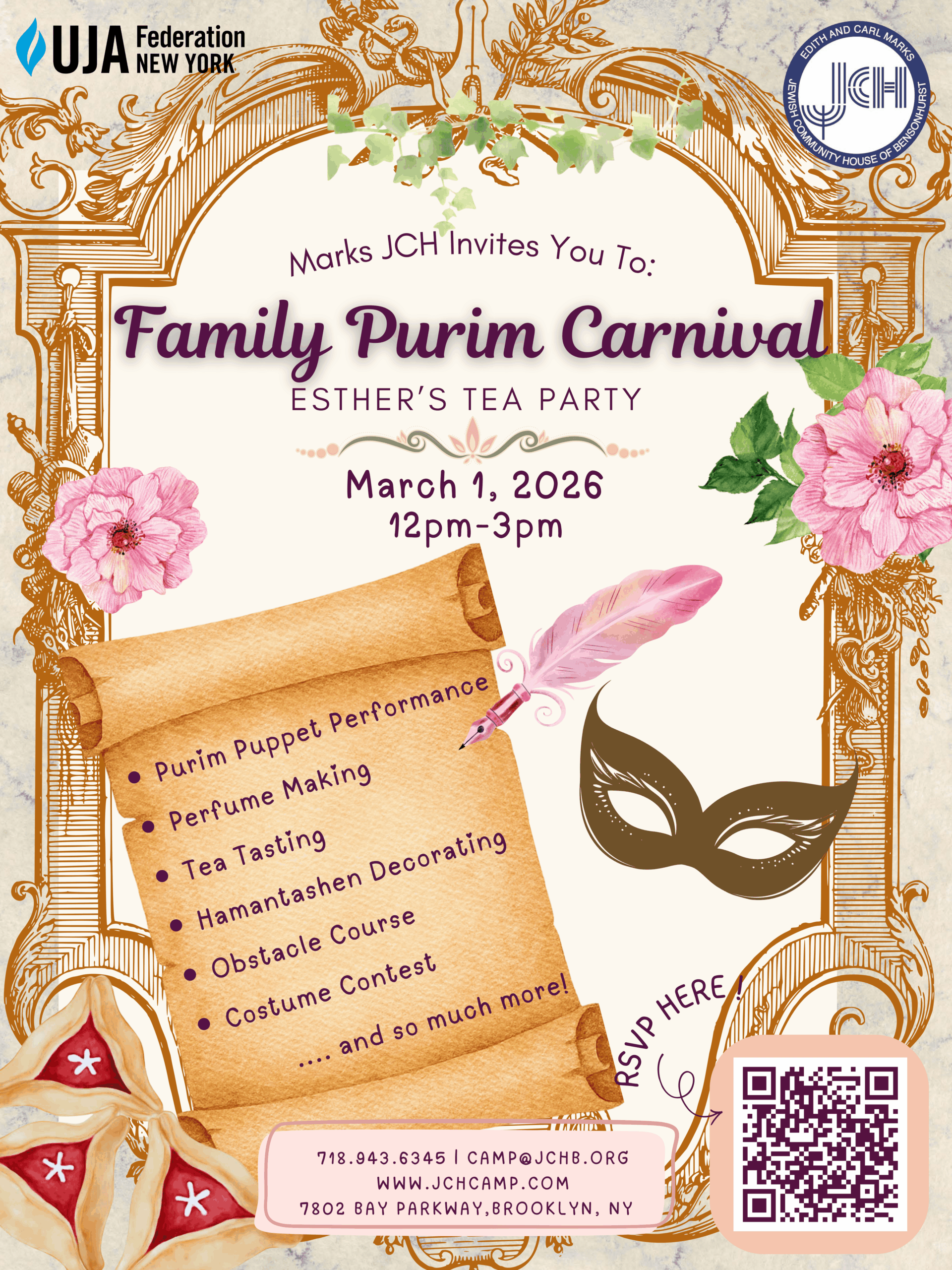 The Senesh School and JCC Brooklyn Summer Day Camp invite families to a Purim celebration with games, inflatables, face painting, music, a Megillah reading, and a costume parade. Enjoy hands-on activities like packing Mishloach Manot, a special JPlay! space for younger kids, and a Purim Passport raffle.