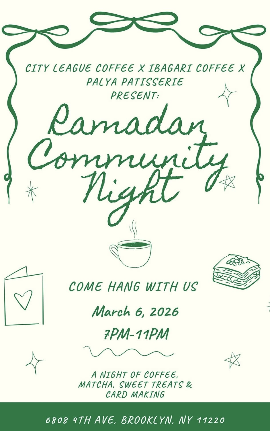 City League Coffee, Ibagari Coffee, and Palya Patisserie will be having a Ramadan Community Night for all ages. There will be coffee, matcha, sweet treats, and card making.