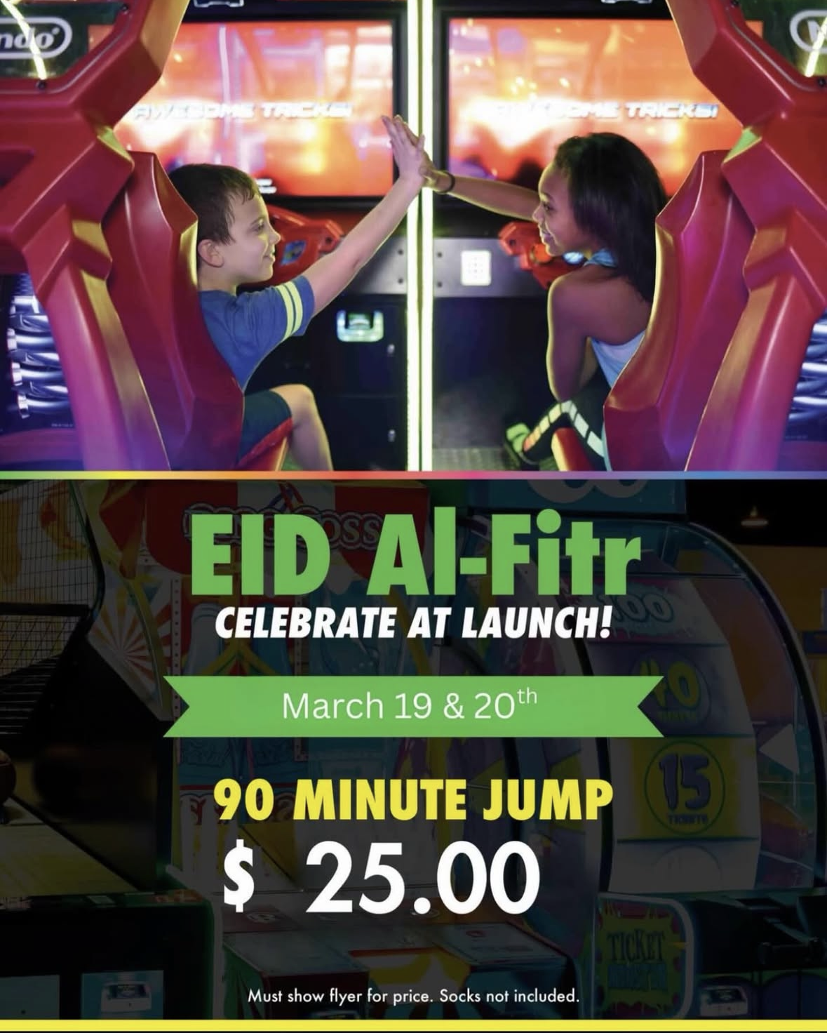 Bring your family and friends to celebrate Eid at Launch. With trampolines, the battle beam, jungle gym, and more, your group is sure to have plenty of fun celebrating!