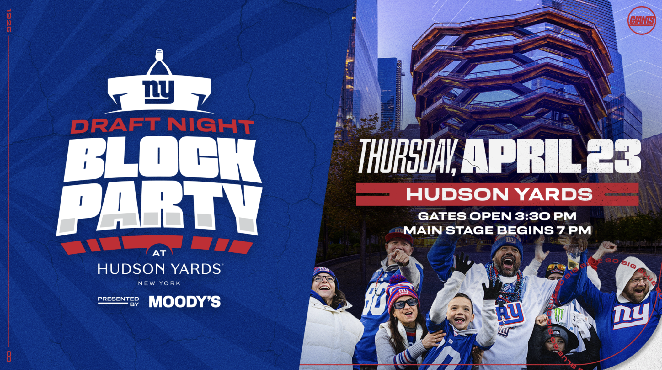 The Giants Draft Party is a fan‑favorite event for all ages, featuring a full slate of high‑energy activations throughout the Public Square and Gardens at Hudson Yards. From 3:30pm-6:00pm, fans can enjoy a live DJ, meet‑and‑greet opportunities with Giants Legends, the Jr. Giants Kids Zone presented by Ford with face painting and activities, and multiple Giants photo stations including the Super Bowl trophy. Giants merchandise, food, and beverages will also be available for purchase. Beginning at 7:00pm, the main stage will kick off with Giants fan DJ Envy energizing the crowd before current players and Legends take the stage. Also hosted on the stage in the evening will be a Jaxson Dart and Cam Skattebo “Look- a-Like” contest where fans are encouraged to come out and participate with the winners being awarded tickets to a home game for the 2026 season and autographed items. Following the stage programming, live coverage of the Giants first round pick selection in the 2026 NFL Draft will be shown on screen.