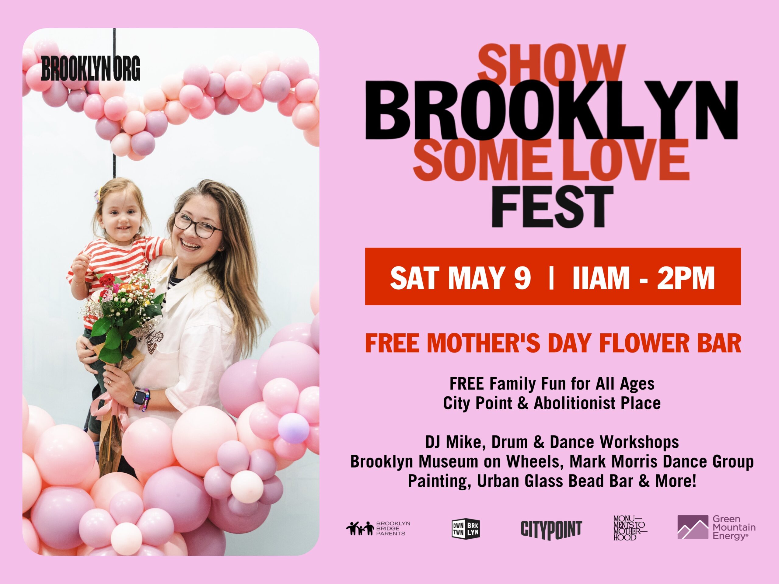The “Show Brooklyn Some Love Fest” Mother’s Day Edition returns to Albee Square/City Point in Downtown Brooklyn — co-hosted by Brooklyn Bridge Parents, Brooklyn Org, and Downtown Brooklyn Partnership, with a free flower bar, family dance party, music, face painting, and treats for moms. Best for families with kids ages 1–10.
