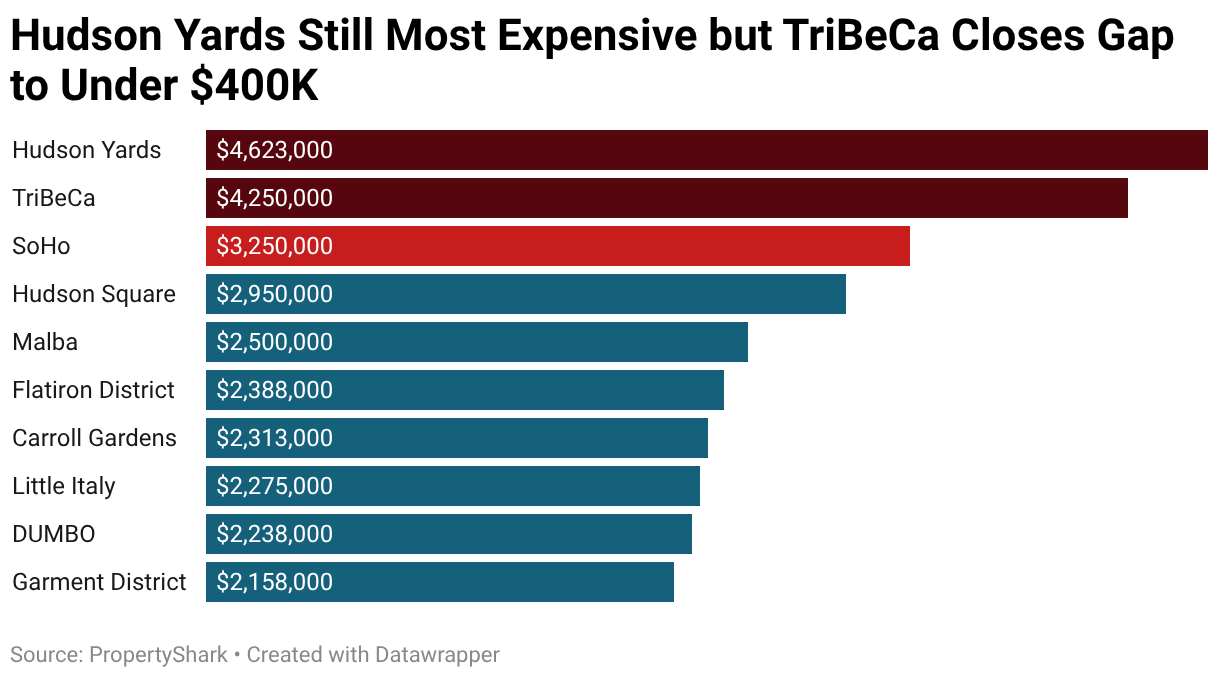 Carroll Gardens took the crown as Brooklyn’s priciest neighborhood (and the 7th most expensive in the entire city). Driven by a wave of luxury family-sized homes—including two single-family houses that sold for over $5 million—the neighborhood’s median price jumped a staggering 67% year-over-year to hit $2.31 million.