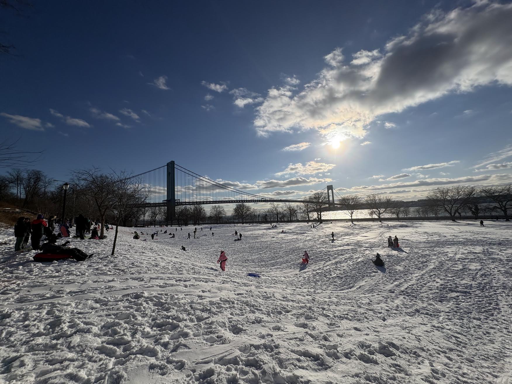 Much of Brooklyn Bridge Park consists of flat piers, with few spots for sledding. However, there are a few hills that are options for first-time sledders.