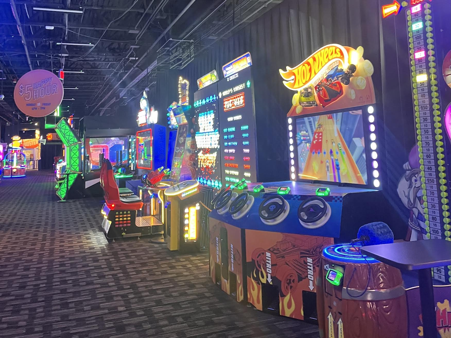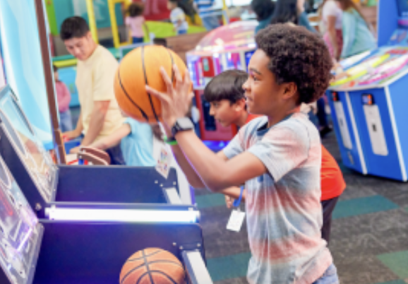 Chuck E. Cheese has trampolines (must be under 56” to jump), kiddie rides, driving games, more arcade games, plus dance sessions and live shows. Open 11:00am-9:00pm Sundays through Thursdays, 11am-10pm on Fridays, and 10am-10pm on Saturdays. No admission fee; guests enter for free and pay for activities and food. You can buy credits, or an All You Can Play Pass for unlimited gameplay for 60 minutes for $19.99, available Monday through Thursday with a coupon. Families can also get a Fun Pass family membership at $7.99 per month, which includes unlimited visits, gameplay, food discounts, and more!