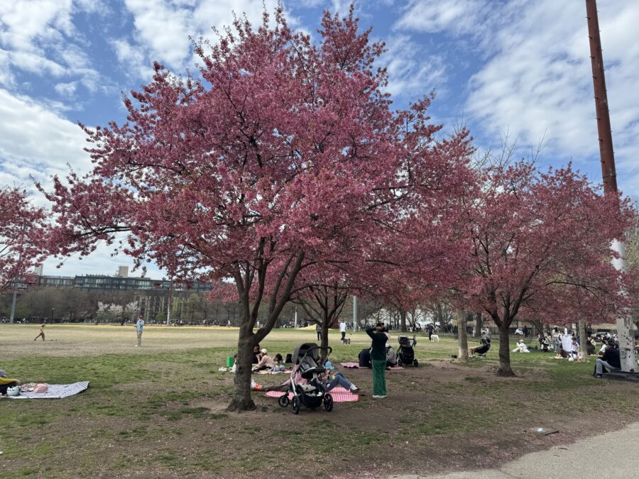 McCarren Park, on the border of Williamsburg and Greenpoint, is one of North Brooklyn’s most dependable places to find cherry blossoms. Paths and lawns are lined with flowering trees, so little ones can enjoy petals overhead whether you’re looping around with a stroller, stopping at the playground, or spreading out for a picnic.