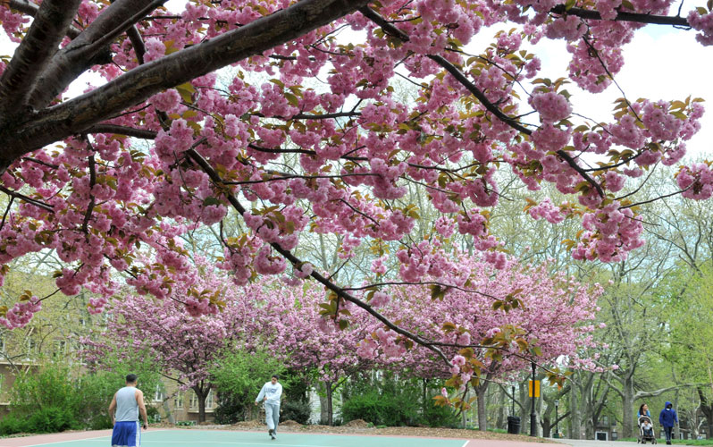 Maria Hernandez Park in Bushwick is a lively, neighborhood-focused place to enjoy cherry blossoms. A generous number of trees turn the main walkways into a pink-lined promenade as they hit their stride, with magnolias often adding to the color.