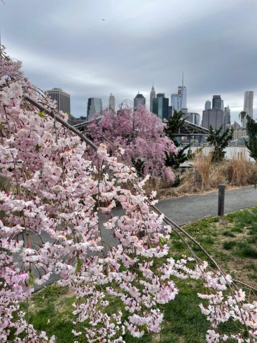 Brooklyn Bridge Park offers a different kind of cherry blossom experience: wide-open lawns, playgrounds, and waterfront views, with pink trees scattered from Pier 2 to Pier 5. As the blossoms peak, some paths become soft tunnels of petals against the backdrop of the Brooklyn Bridge and NYC skyline.
