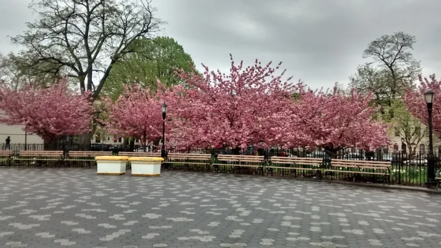 In Greenpoint, small parks pack a big spring punch. Local greenspaces feature flowering trees around lawns and paths, often mixing cherry trees with magnolias and other early blooms.